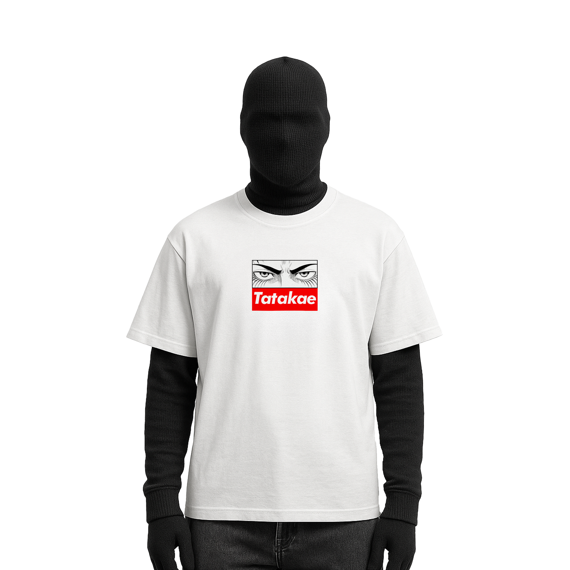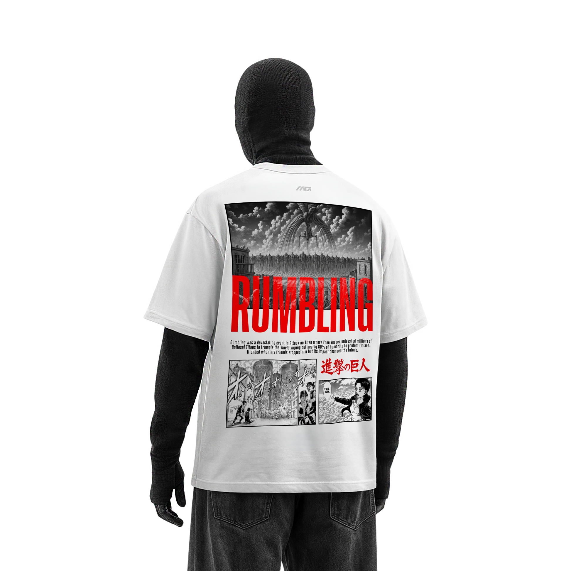 This oversized white tee is a tribute to one of the most powerful moments in anime history, capturing the weight of Eren Yeager’s choice and the unstoppable force of the Rumbling. The back print portrays the march of the Colossal Titans and the devastation they bring, reminding us of the cost of freedom and the burden of destiny. The front keeps it stark and commanding with Eren’s piercing gaze and the word “Tatakae,” a call to fight that resonates with anyone who refuses to surrender. This piece is not just apparel but a statement about conviction, struggle, and the price of changing the world.