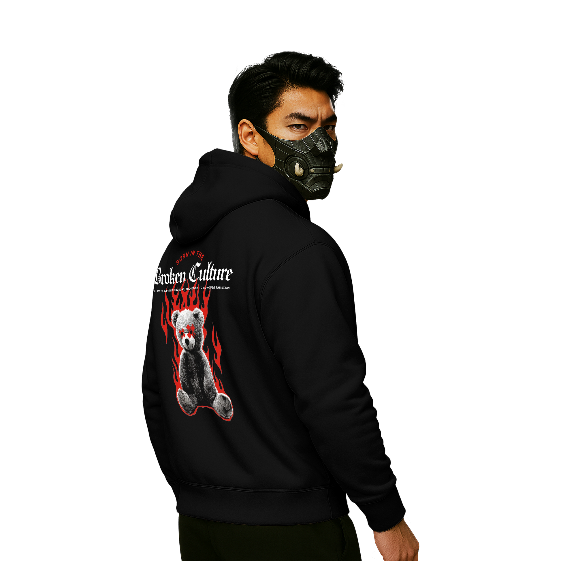 The back transforms this vision into a statement piece. A grayscale teddy bear sits surrounded by red flames beneath the declaration “Born in the Broken Culture.” It symbolizes innocence consumed by modern decay and the restless energy of a world too late to conquer kingdoms and too early to conquer the stars.