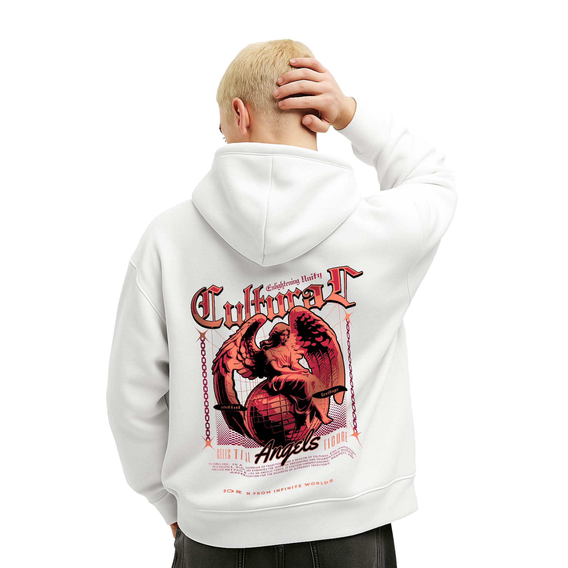 A symbol of unity and elevation. The back features a celestial figure seated on a globe, framed in bold red tones and gothic lettering — representing culture as something built, carried, and passed between worlds. The chains and grid elements contrast tradition with modern identity, giving it a timeless yet street-rooted tone. The front stays minimal with a sharp red insignia for a quiet flex. Born From Infinite Worlds — culture is not inherited, it’s created.