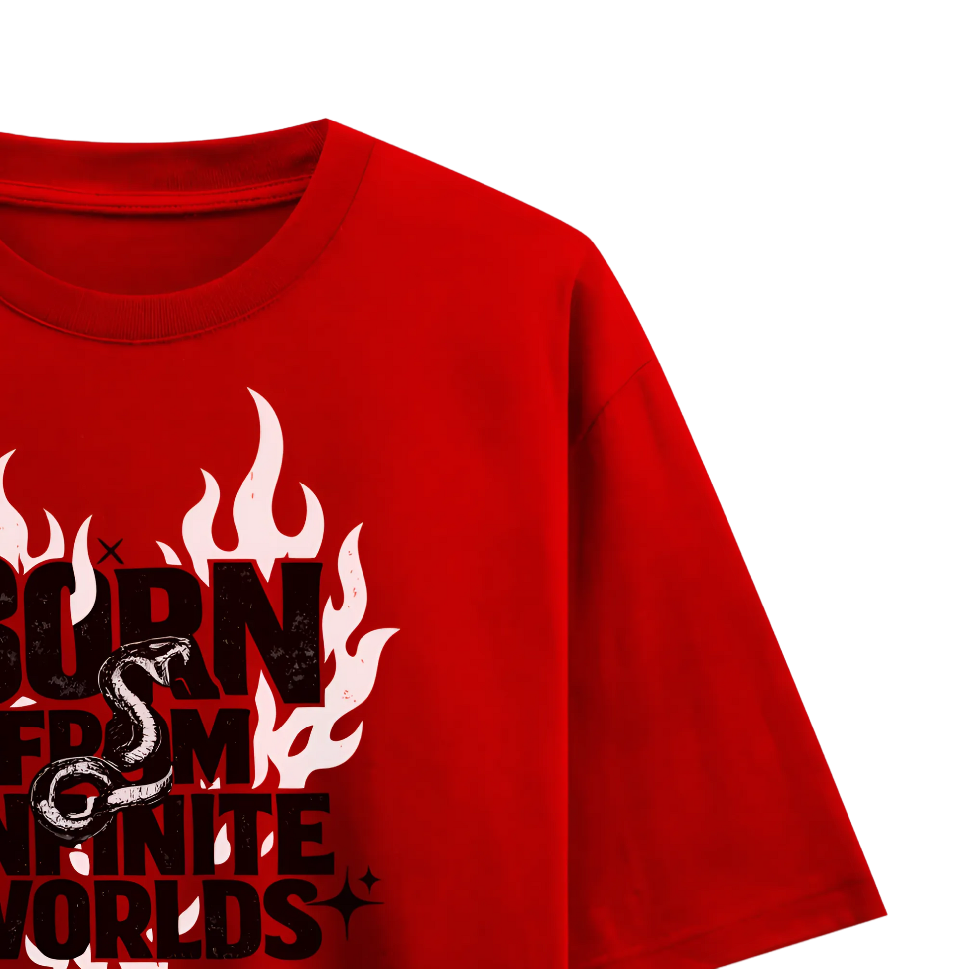 Explosive in tone and color, this piece fuses flame graphics with layered typography to create a high-impact visual. The bold red base intensifies the message, while the central artwork adds mythic, almost cinematic energy. It feels loud, fearless, and unapologetic. Designed for those who see themselves as products of multiple influences and infinite possibilities, it turns identity into spectacle.