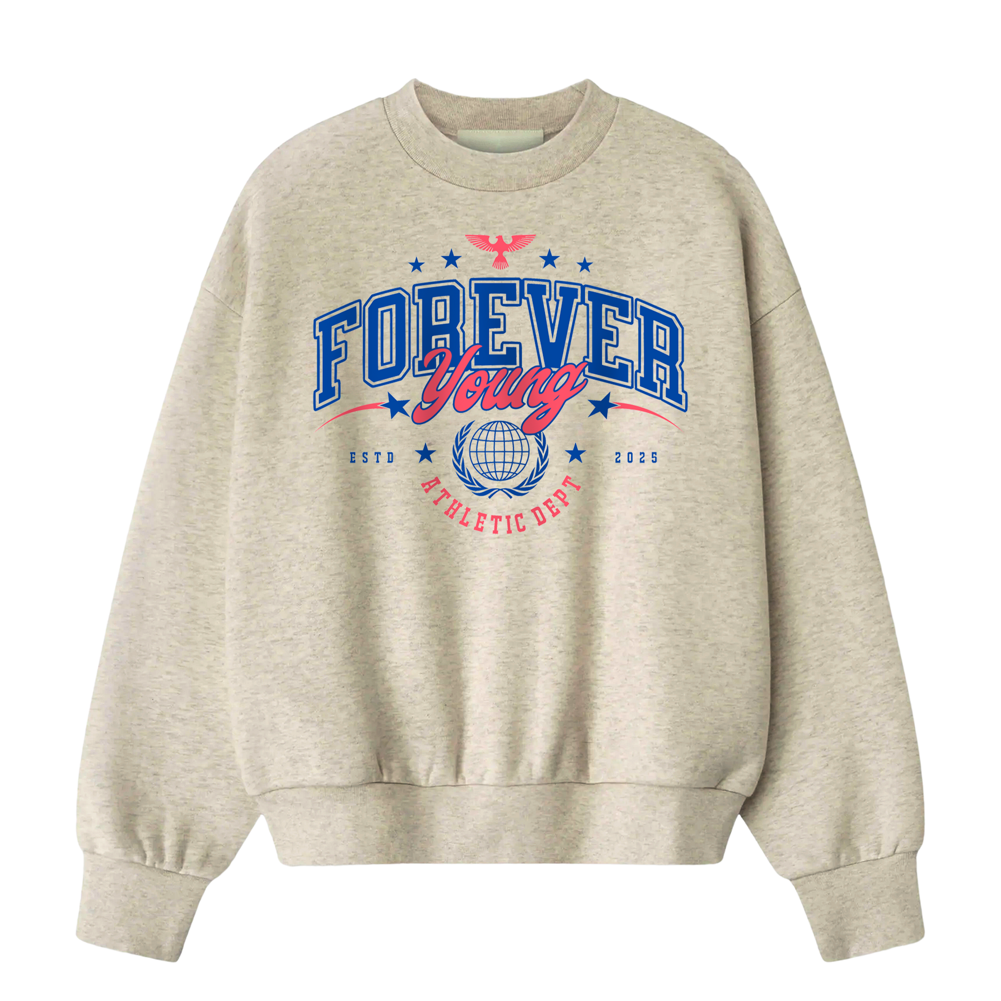 The Forever Young design blends vintage athletic heritage with a modern streetwear edge, creating a piece that feels both nostalgic and forward-moving. Centered around bold collegiate lettering, a soaring eagle, and a world emblem, it celebrates those who stay hungry for more no matter where life takes them. Crafted for everyday comfort with a relaxed silhouette, it’s made for people who refuse to outgrow their fire. Wear it as a reminder that youth isn’t an age — it’s a mindset.