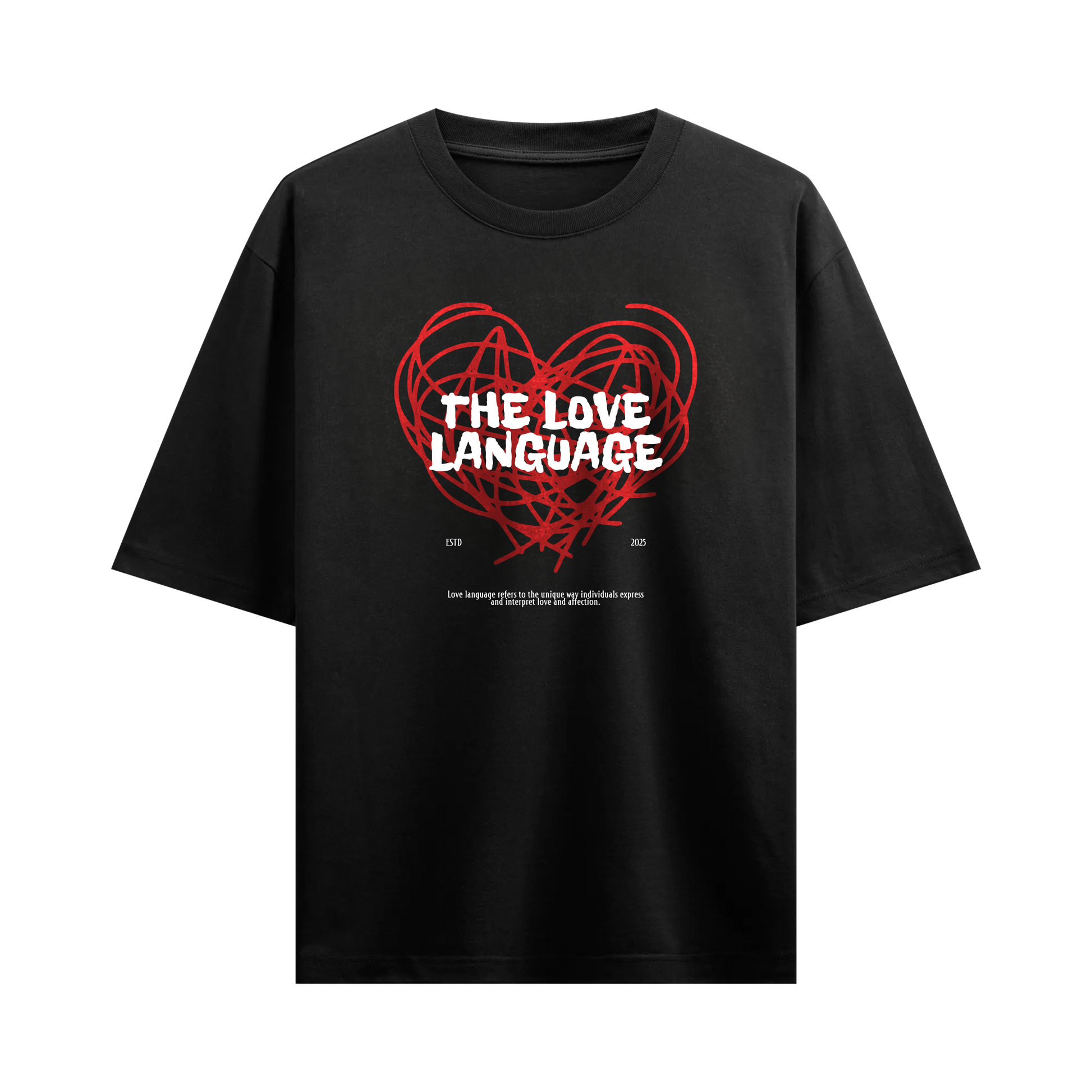 A raw expression of emotion wrapped in street minimalism, this piece turns vulnerability into visual impact. The front features a chaotic heart sketch layered with bold typography, symbolizing the complexity of connection in a modern world. Clean from the back with subtle branding at the neckline, it carries the balance of statement and restraint. Designed for those who see love as rebellion and softness as strength, this tee feels like wearable poetry translated into street culture.
