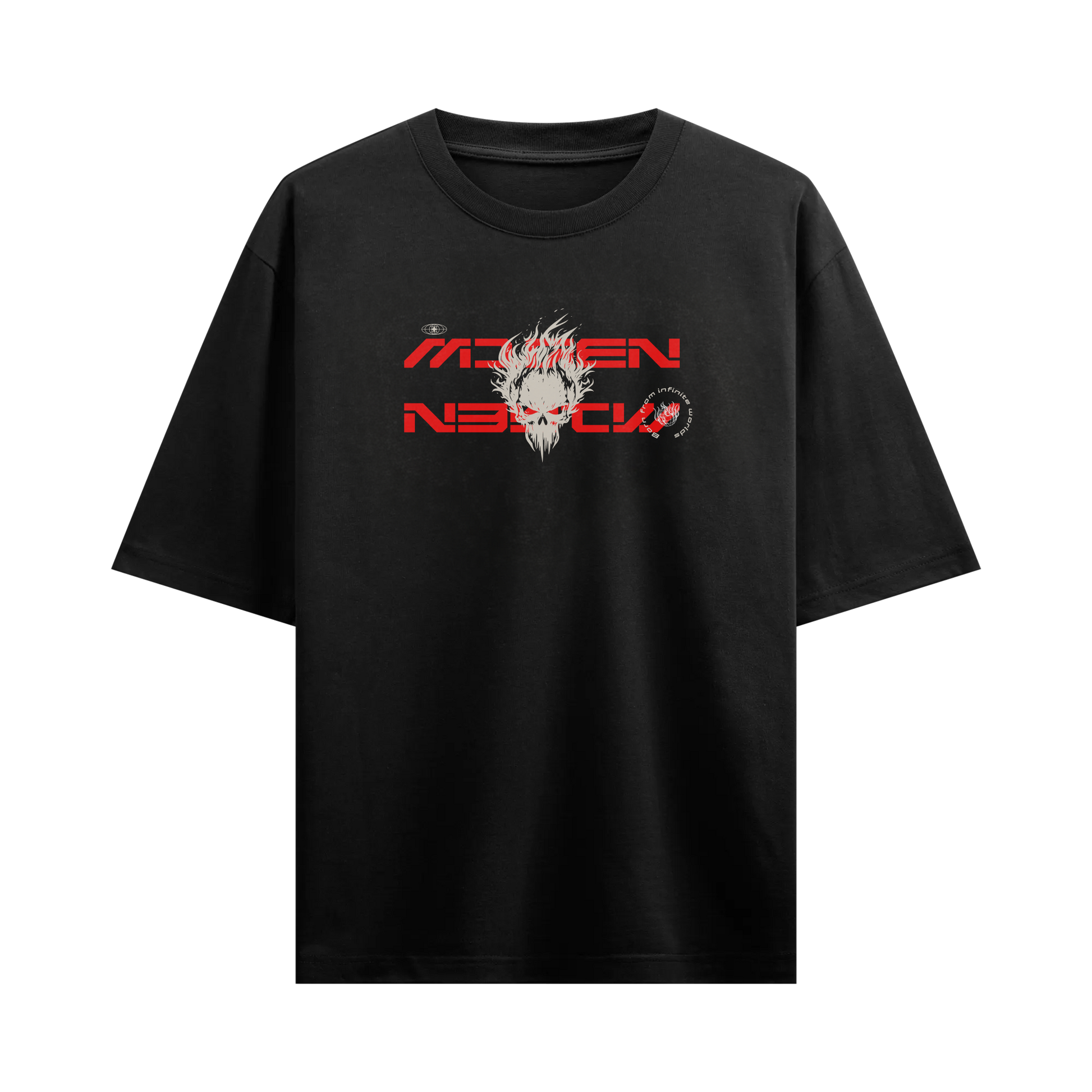 Dark, intense, and graphic-forward, this piece merges bold typography with skull and cross motifs to create a dystopian visual language. The front remains sharp and minimal, while the back delivers a layered composition that feels like a poster pulled from an underground universe. It carries the energy of chaos meeting structure. Designed for those drawn to rebellion, alternate realities, and unapologetic self-expression.