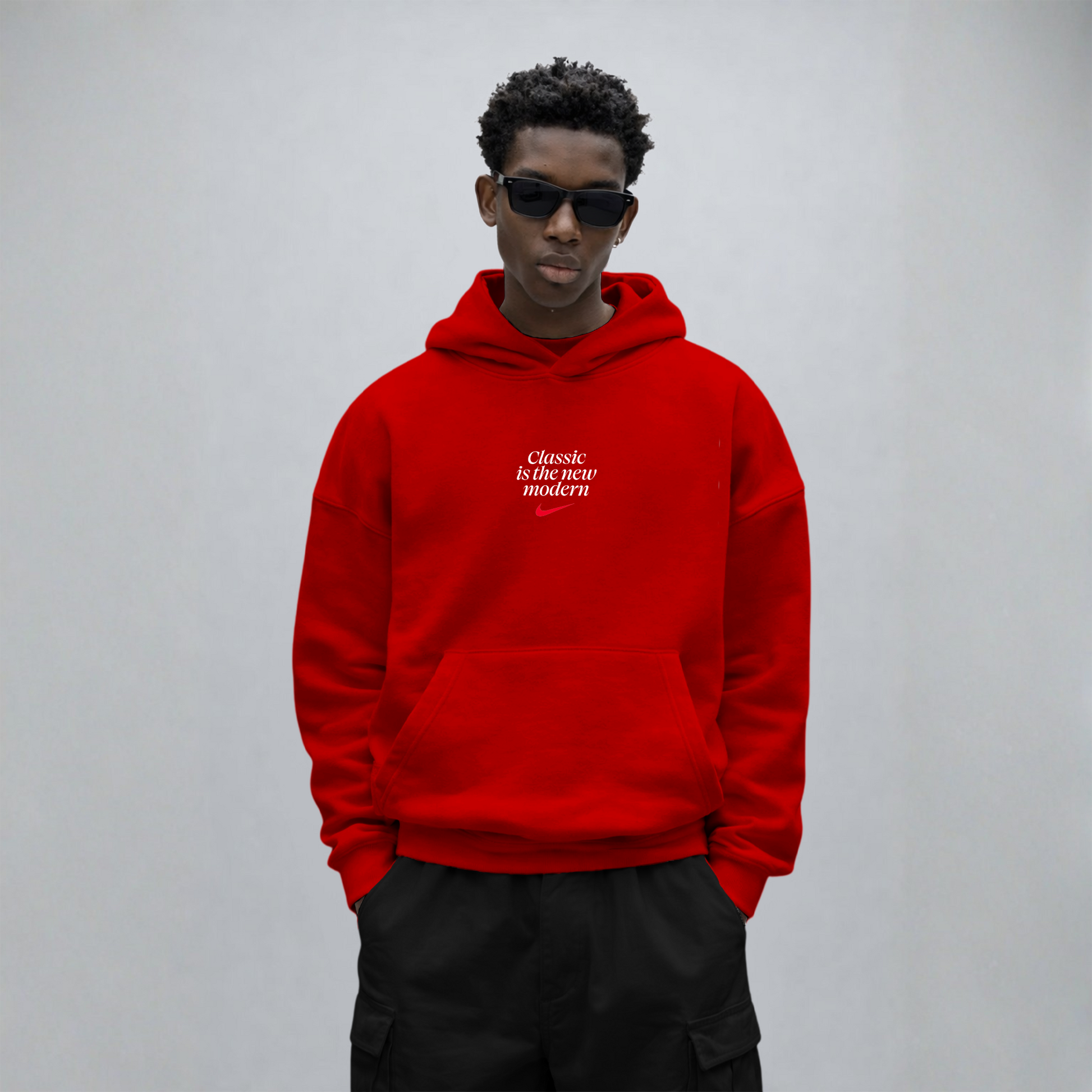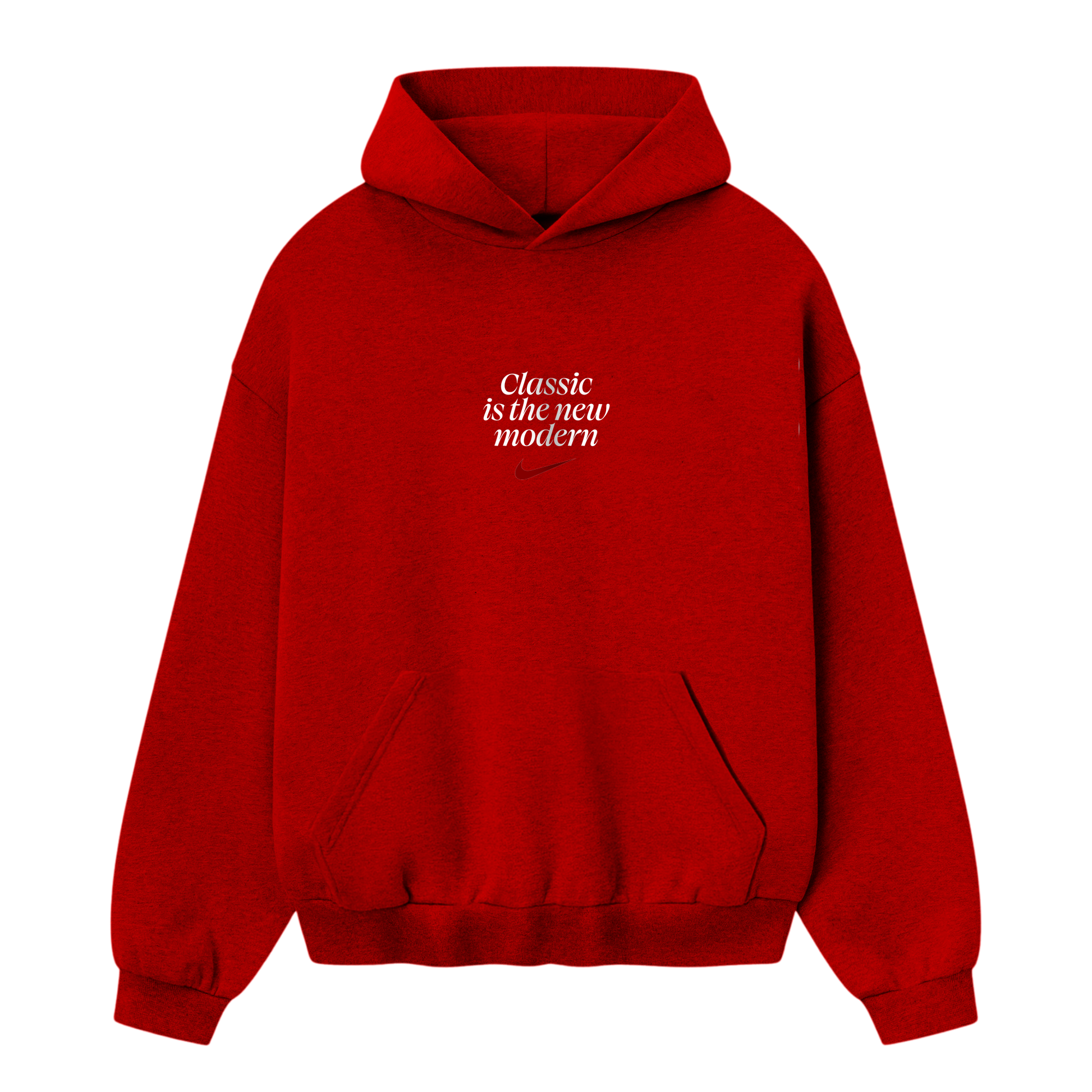 A loud statement piece built straight from sneaker culture. The back features bold typography and a classic high-top silhouette, calling out the fact that hype, attention, and status always orbit around the right pair on your feet. It’s playful, it’s blunt, and it doesn’t ask for permission. The front keeps it simple with “Classic is the new modern” for everyday wear when the flex doesn’t need volume. If you know the culture, you get it.