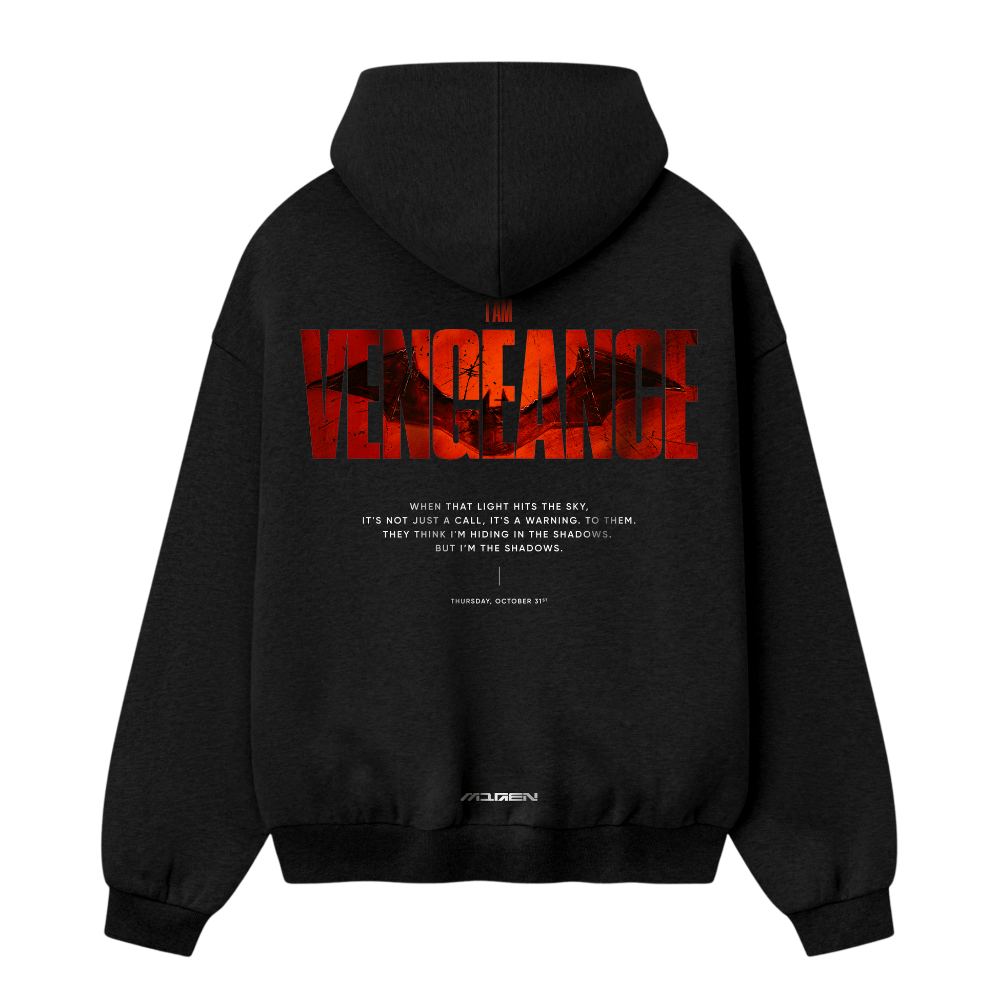 Unleash your dark side with the I Am Vengeance hoodie — a tribute to the myth, the symbol, and the shadow that strikes fear before it strikes back. Featuring a bold distressed typography set over a crimson silhouette, this piece captures the raw grit of a vigilante rising from darkness. The quote beneath marks the transformation: a call answered not by a hero, but by a warning. Heavy, atmospheric, and unapologetically iconic — this hoodie is built for those who walk in the night but stand for their own justice.